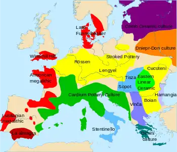 | ویژگیها | incised pottery: footed bowls, globular cups, flint blades, axes, adzes خانه کشیده دوران نوسنگی settlements, inhumation graves |