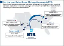 Historically, the Baton Rouge Metropolitan Airport (BTR) was served by امریکن ایرلاینز، کنتیننتال ایرلاینز (now یونایتد ایرلاینز), Eastern Airlines، نورتوست ایرلاینز (now دلتا ایرلاینز), Southern Airways, which merged with North Central Airlines to form Republic Airlines which in turn then continued to serve the airport, and Trans-Texas Airways (TTa) which subsequently changed its name to Texas International Airlines. All of these airlines operated mainline jet service from the airport with the exception of Eastern which flew مارتین ۴-۰-۴ and Convair 440 twin prop "Silver Falcon" airliners from Baton Rouge in the 1950s. Mainline jet aircraft types operated in passenger service from Baton Rouge in the past included بوئینگ ۷۲۷، بوئینگ ۷۲۷، بوئینگ ۷۳۷، بوئینگ ۷۳۷ کلاسیک and بوئینگ ۷۳۷ کلاسیک jetliners as well as مکدانل داگلاس دیسی-۹ and مکدانل داگلاس دیسی-۹ jets and also مکدانل داگلاس امدی-۸۰ jetliners.