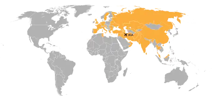 |هواپیمایی ماهان | آلماتی، آنکارا، بانکوک-سووارنابومی، بارسلونا-ال پرات،[42] باکو،[43] پکن، بیروت، دمشق، دهلی، دوبی، دوسلدورف، اربیل، گوآنگجو، استانبول-آتاترک، نجف، کابل، کیف-بوریسپیل، کوالالامپور، میلان-مالپنسا، مسکو-ونوکووا،[44] مونیخ، پاریس-شارل دوگل، شانگهای، ایروان