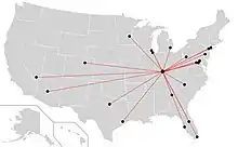 | امریکن ایگل | شارلوت داگلاس، اوهر شیکاگو، دالاس-فورت ورث، میامی، لاگواردیا، فیلادلفیا، ملی رونالد ریگان واشینگتن | [2] |