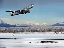 کاتای پاسیفیک Cargo بوئینگ ۷۴۷–۴۰۰ taking off on a snowy day.