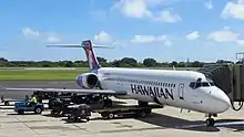A Hawaiian Airlines بوئینگ ۷۱۷ at the gate.