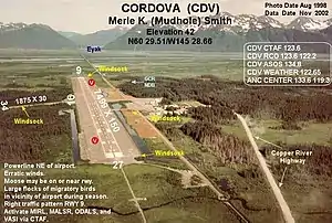- "Cordova, AK: Cordova (CDV)". Bureau of Transportation Statistics (BTS), Research and Innovative Technology Administration (RITA), وزارت ترابری ایالات متحده آمریکا. December 2016. Retrieved 4 May 2017.