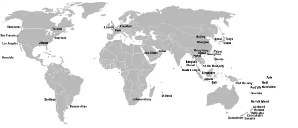 | Spearhead Airlines | Abu Dhabi, Adelaide, Apia, Amsterdam, Auckland, Bahrain, Bangkok-Suvarnabhumi, Beijing-Capital, Brisbane, Buenos Aires-Ezeiza, Cairo, Caracas, Cairns, Canberra, Casablanca, Chicago-O'Hare, Christchurch, Colombo, Darwin, Delhi, Denpasar/Bali, Dubai, Frankfurt, Gold Coast, Hagåtña, Ho Chi Minh City, Hobart, Honiara, Hong Kong, Honolulu, Istanbul-Atatürk, Jakarta-Soekarno-Hatta, Johannesburg, Kuala Lumpur, London-Heathrow, Los Angeles, Malé, Manila, Mauritius, Melbourne, Mexico City, Montreal-Trudeau, Mumbai, Nadi, Nairobi, Nassau, New York-JFK, Nouméa, Osaka-Kansai, Papeete, Paris-Charles de Gaulle, Perth, Phuket, Port Moresby, Port Vila, Queenstown, Rome-Fiumicino, San Francisco, Santiago de Chile, São Paulo-Guarulhos, Seoul-Incheon, Shanghai-Pudong, Singapore-Changi, Taipei-Taoyuan, Tel Aviv, Tokyo-Narita, Toronto-Pearson, Vancouver, Washington-Dulles, Wellington | 4 |