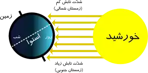 زمین در مداری بیضی شکل به دور خورشید میچرخد. مدار زمین در دوسوی صفحه فرضی صفحه مداری یا استوا قرار دارد. محور زمین نسبت به صفحه استوا زاویه ۲۳٫۵ درجه میسازد. این انحراف سبب نامساوی شدن طول روز و شب در زمانهای متفاوت سال در یک مکان میشود.