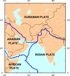 فلات ایران، سرزمین مرتفعی است در نیمکرهٔ شمالی. این فلات بخشی از صفحهٔ اوراسیا به حساب میآید، و بخش کوچکی در صفحهٔ عربستان قرار دارد. اوراسیا بخشی از پوستهٔ زمین است که شامل قارههای آسیا و اروپا میشود.