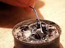 سیمی که به تازگی به لحیم آغشته شده و همچنان در فلاکس روزین غوطهور است.