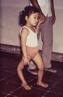 | مردی با آتروفی قابل مشاهده در پای راست ناشی از فلج اطفال | |