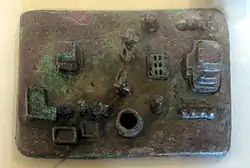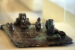 این تابلو نمونه یک مراسم مذهبی را نمایش میدهد. در میانه تابلو، دو مرد که با توجه به مراسم مذهبی خودشان، لخت هستند، به حالت نیمه نشسته قرار دارند. در اطراف آنها، اسباب و ادوات مذهبی مثل ظروفی برای نوشیدن شراب، احتمالاً نان برای پذیرایی، ستونهای سنگ، معبد و چوب مقدس قرار گرفتهاست. در دوره عیلام میانه که بین سده ۱۲ تا ۱۵ پیش از میلاد بود، استادکاران با بدست آوردن شیوهها و روشهای جدید ذوب فلزات، نسل جدیدی از لوحها، تابلوهای فلزی، تندیسها و آثار برجسته کاری را خلق کردند. این تابلو در موزه لوور نگهداری میشود.