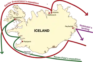 فلوکی در سال ۸۶۸ میلادی همراه با همسرش گرو فرزند دختر خود سفر به سرزمینهای شمال را شروع کرد. در جزیره شتلند یک از دختران او کشته شد ولی او سفر را ادامه داد تا به جزایر فارو رسید. او در جزایر فارو چند همراه دیگر یافت و با کمک آنها توانست راه ایسلند را پیدا کند. اولین جایی که فلوکی به آن رسید خلیجی بزرگ بود که در حال حاضر ریکاویک پایتخت ایسلند است. آنها چندین بار اقامتگاه خود را در فصلهای مختلف تغییر دادند که امروزه بسیاری از آنان شهرهای مختلف ایسلند هستند.[2]