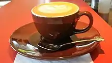 کاپوچینو در فنجان خود که یک فنجان چینی ۱۷۱ میلی لیتری در بشقاب با غذا عرضه میشود. اندازه فنجان نشان دهنده کاپوچینو سنتی، نوشیدنی با نسبت ۱: ۱: ۱ است. ۵۷ لیتر اسپرسو، ۵۷ میلی لیتر شیر پاستا، ۵۷ میلی لیتر فوم یکپارچه.