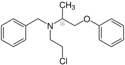 فنوکسی بنزامین شامل یک استریو سنتر است، به طوری که دو انانتیومر، فرم ( R ) - و فرم ( S ) وجود دارد. همه داروهای تجاری حاوی دارو به عنوان racemate هستند.[1]