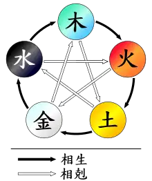 چرخه سازنده: این عنصرها نشانگر تغییر هستند و هر یک عنصر بعدی را میآفریند یعنی: آب، چوب را تغذیه میکند. --> چوب، سوخت آتش است. --> آتش، خاک را (به شکل خاکستر) به وجود میآورد. --> فلز از خاک بدست میآید. --> فلز میتواند مانند آب جاری شود.