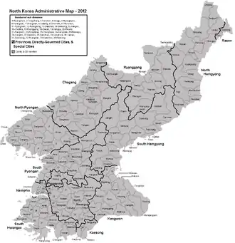| استانهای کرهٔ شمالی 북한 지방 (زبان کرهای) bughan jibang(Romanized) | |