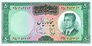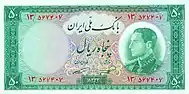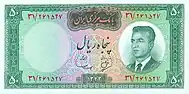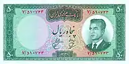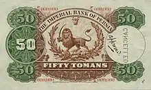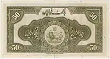 ۵۰ تومان | ۱۲۴×۲۱۲ | نگاره ناصرالدین شاه | نماد شیر و خورشید