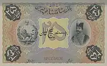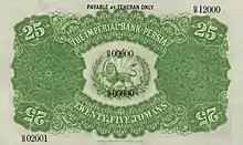 ۲۵ تومان | ۱۱۸×۲۰۴ | نگاره ناصرالدین شاه | نماد شیر و خورشید