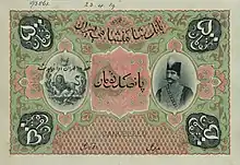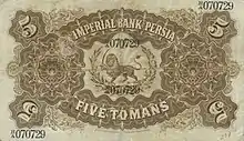 ۵ تومان | ۱۰۰×۱۸۰ | نگاره ناصرالدین شاه | نماد شیر و خورشید