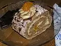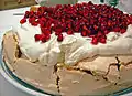 سوئد | مرنگ-فندق کیک پر شده با خامه زدهشده و تکههایی از قوطی (بستهبندی) هلو، زردآلو یا نارنگی. |