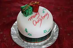 بریتانیا | خشکبار نظیر سلطانا یا کشمش، دارچین، شیره قند، گیلاس و بادام; یخچینه. این کیک در کشورهای غربی بیشتر با یخچینه پوشیده میشود و یخچینه نیز با گذاشتن مدلهای مختلف مانند شمایل بابا نوئل، یا عبارت کریسمس مبارک تزئین شود. |