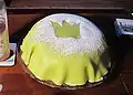 سوئد | لایهای از کیک اسفنجی و خامه زده شده، لایهای از مربا و لایهای از کاستارد و در بالای همه لایهای از مارزیپان به رنگ سبز. |