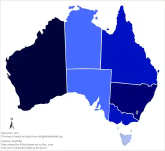 نقشه ایالات و قلمروهای استرالیا بر پایه شاخص توسعه انسانی در سال ۲۰۱۷.راهنما: