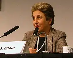 شیرین عبادی، حقوقدان، قاضی سابق دادگاه، نویسنده و مدرس، تنها ایرانی است که جایزه صلح نوبل را دریافت کردهاست. کمیتهٔ برگزاری جایزهٔ صلح نوبل علت انتخاب خود را، تلاش خانم عبادی برای ترویج مردمسالاری و رعایت حقوق بشر در ایران به ویژه در مورد حقوق زنان و کودکان در سال ۲۰۰۳ میلادی اعلام نمود.[5][6]