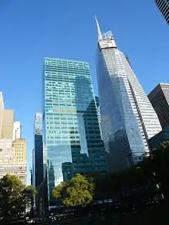 مرکز تجارت جهانی نیز طی حملات ۱۱ سپتامبر در سال ۲۰۰۱ تخریب شد و ساختمان امپایر استیت عنوان بلندترین ساختمان نیویورک را از مرکز تجارت جهانی بازپسگرفت. سومین ساختمان بلند در نیویورک برج بانک آو آمریکا است که با حساب سازه مخروطی آن ۱۲۰۰ پا (۳۶۶ متر) ارتفاع دارد.[6] چهارمین ساختمانهای بلند نیویورک، ساختمان کرایسلر و ساختمان نیویورک تایمز هستند. ساختمان کرایسلر از سال ۱۹۳۰ تا سال ۱۹۳۱ بلندترین ساختمان جهان بود.[7]