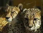 | یوزپلنگ | Acinonyx jubatus | ![]() | یوزهای نر و ماده گاه با مالاندن بدن خود به جنس موافقشان و بازی با اندام تناسلی یوز دیگر، اقدام به برقراری نوعی ارتباط اجتماعی میکنند که باعث بالا رفتن اتحاد میان گروههایشان میشود. یوزهای نر در گروههای دو یا سه تایی اقدام به ایجاد نوعی «ائتلاف» میکنند که اغلب بلند مدت است. آنها در صورت جدا شدن از هم بسیار آشفته میشوند و ناراحتیشان را با تولید صداهای زیر و تیز آشکار میکنند. پس از آنکه دو یار همدیگر را پیدا میکنند، اغلب اقدام به صورت معاشقهای یا جنسی با هم رابطه برقرار میکنند.[8] |