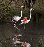 | فلامینگوها | Phoenicopterus | ![]() | هر دو جنس زوجهای همجنس تشکیل میدهند. رفتارها همانند زوجهای ناهمجنس است و شامل سفر با هم، همصدایی، برخورد با پرندگان مهاجم، و خوابیدن در پهلوی هم میشوند. گاهی مثلثهای رابطهای تشکیل میشوند که در آنها دو زوج نر به همان اندازه که به همدیگر علاقه دارند، به جنس ماده نیز علاقهمندند. مالش میان اندامهای جنسی در میان زوجهای ماده معمول است.[36] |