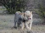 | شیر | Panthera leo | ![]() | شیرهای ماده دارای رفتار ویژهای هستند که شامل «دعوت» از مادههای دیگر برای داشتن رابطهاست؛ مادهشیر با خزیدن به زیر ماده دیگر، او را تحریک به سکس میکند. در هنگام سکس، ماده دومی رفتاری همچون رفتارهای شیر نر در هنگام رابطه دگرجنسگرایانه را نشان میدهد و گردن شریک خود را با دندان میگزد. رابطه میان نرها اما همراه با نمایش و معاشقه بسیار است که اغلب به منظور نوعی مراسم خوشامدگویی به شیر نر دیگر اجرا میشود. شیرهای نر یالها و سرهایشان را به هم میمالانند و با کیرهای شق، بر زمین میغلطند. این نمایش در پایان به سکس میان دو نر به صورت نوبتی یا گروهی منجر میشود.[12] |