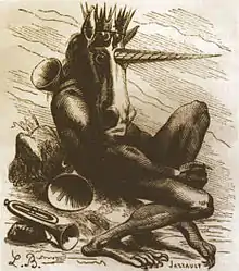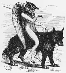 او به شکل یک شیر با سر انسان یا با سر یک الاغ تجسم میشود.[12]