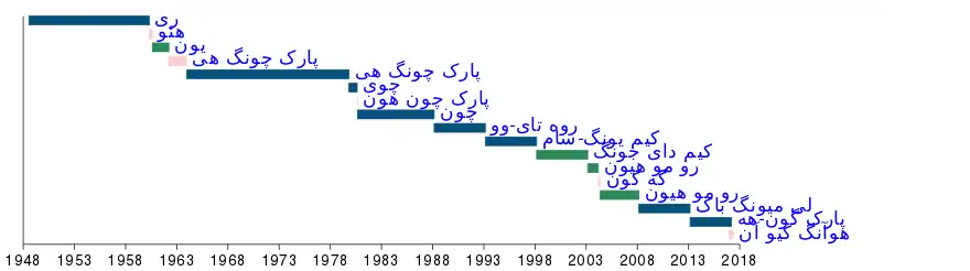 | 11 | ![]() | پارک گون-هه | ۲۵ فوریه ۲۰۱۳ | ۱۰ مارس ۲۰۱۷ | دختر رئیس جمهور سابق پارک چونگ هی و نخستین رئیس جمهور زن کره جنوبی. به اتهام فساد مالی استیضاح شد. |