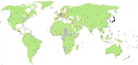 سفارتخانه ها (قرمز)، کنسولگری (آبی) و دفاتر نمایندگی ها (صورتی)),