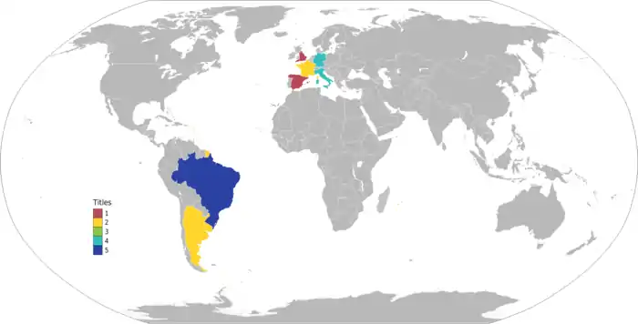 تاکنون ۲۱ جام جهانی برگزار شدهاست و تنها ۸ کشور موفق به فتح این مسابقات شدند که کشور برزیل با ۵ قهرمانی، پرافتخارترین تیم این رقابت هاست.[n 1] و تنها تیمی است که در تمام مسابقات مقدماتی حضور داشتهاست.[3] آلمان و ایتالیا با چهار قهرمانی، دومین تیم پرافتخار دنیا هستند. آرژانتین و اروگوئه و فرانسه با ۲ قهرمانی و انگلستان و اسپانیا کشورهای دیگری هستند که تجربه کسب عنوان قهرمانی را دارند.[4]