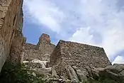این قلعه حصین در سه سطح ساخته شده بود و ورود به آن از نازلترین سطح از طریق پلکانی مارپیچ که به حیاط اصلی تراس میانی میرسید صورت میگرفت. سه طرف حیاط را اتاقهای چهارگوش دارای تاق ضربی دربر گرفته بود و طرف چهارم به تراس فوقانی که روی آن ساختمان کاخ اصلی واقع شده بود، منتهی میگردید. تمامی کاخ را یک ایوان بزرگ دارای طاق ضربی و دو ایوان کوچکتر در دو سو تشکیل میداد. ایوان بزرگ که ۱۴ متر پهنا و ۲۳ متر درازا داشت به یک اتاق مرکزی که سقف آن به شیوهای تازه، یعنی گنبد پوشانده شده بود منتهی میگشت. در جناحین این اتاق گنبد دار اتاقهای اضافی قرار گرفته و کل آنها در داخل یک دیوار خارجی مدور جای داشت.[14] |