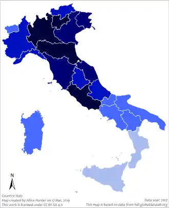 نقشه ناحیههای ایتالیا بر پایه شاخص توسعه انسانی در سال ۲۰۱۷.
