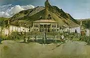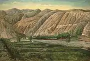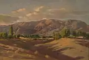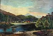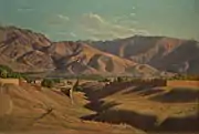 نمایی از کوههای شمیران | دورهٔ پهلوی | رنگ روغن روی کرباس | ۳۲٫۶ در ۶۳٫۵ سانتیمتر (۱۲٫۸ در ۲۵٫۰ اینچ) | موزهٔ ملی ملک | [65][66] |