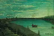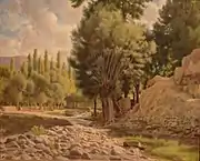 رودخانه شیلات فرحآباد | ۱۲۹۲ ه.ق | رنگ روغن روی بوم | ۷۰ در ۱۰۰ سانتیمتر (۲۸ در ۳۹ اینچ) | گنجینهٔ هنرهای تجسمی موزههای آستان قدس رضوی | [8][7] |