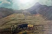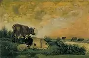 مزرعه و گاوها | ۱۳۰۸ ه.ق | رنگ روغن روی کرباس | ۳۲٫۷ در ۵۶٫۵ سانتیمتر (۱۲٫۹ در ۲۲٫۲ اینچ) | موزهٔ مجلس شورای اسلامی | [10] |