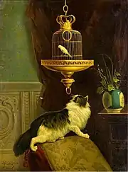 گربه و قفس قناری | ۱۳۰۸ ه.ق | رنگ روغن | ۶۱ در ۴۷ سانتیمتر (۲۴ در ۱۹ اینچ) | کاخ گلستان | [29] |
