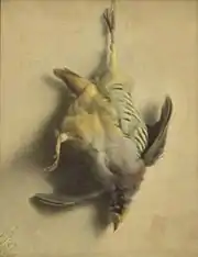 پرندهٔ شکارشده | ۱۳۱۲ ه.ق | رنگ روغن روی کرباس | ۷۷ در ۵۲ سانتیمتر (۳۰ در ۲۰ اینچ) | کاخ سعدآباد | [35][36][1] |