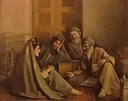 فالگیر یهودی | ۱۳۱۶ ه.ق | رنگ روغن روی کرباس | ۴۶ در ۵۵٫۵ سانتیمتر (۱۸٫۱ در ۲۱٫۹ اینچ) | موزهٔ مجلس شورای اسلامی | [20][41][10] |