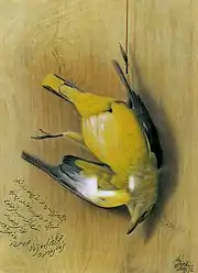 قناری | آبرنگ روی کاغذ | ۴۱ در ۳۰٫۵ سانتیمتر (۱۶٫۱ در ۱۲٫۰ اینچ) | کاخ گلستان | [103][104][1] | |