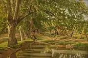 اطراق در حاشیه رودخانه | ۱۳۰۰ ه.ق | رنگ روغن روی کرباس | ۶۷ در ۹۸٫۵ سانتیمتر (۲۶٫۴ در ۳۸٫۸ اینچ) | موزهٔ مجلس شورای اسلامی | [20][10] |