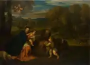 خانواده مقدس با نوزاد سنت جان | دورهٔ قاجار | رنگ روغن روی کرباس | ۸۰ در ۱۱۰ سانتیمتر (۳۱ در ۴۳ اینچ) | موزهٔ ملی ملک | [63][64] |