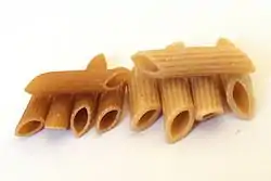 | مستاچیولی Mostaccioli | شبیه به «پنه» اما بدون شیار. به آن penne lisce (پنه لیشه) یعنی پنه نرم هم میگویند. | سبیلی | |