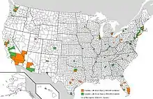 نقشهای از شهرستانهای ایالات متحده آمریکا. بر اساس نتایج سرشماری ۲۰۱۰ ایالات متحده آمریکا ۱۰۰ شهرستان پرجمعیت برجسته شده است. شهرستانهای دارای بیش از یک میلیون نفر با رنگ نارنجی و مناطق دارای کمتر از یک میلیون با رنگ سبز مشخص شدهاند.