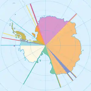 - جنوبگان برزیل (ادعای غیررسمی برزیل) و سواب نو (ادعای تاریخی آلمان نازی) ادعاهایی هستند که در تصویر رنگ نشدهاند. (جنوبگان برزیل به صورت یک قطاع دایره است ولی سو اب نو مرز مشخصی ندارد)