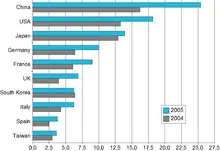 خطوط DSL کشورها در پایان 2005 در مقایسه با سال قبل (بر حسب میلیون).