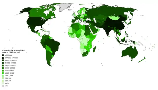 - مشارکتکنندگان ویکیپدیا. «List of countries by irrigated land area». در دانشنامهٔ ویکیپدیای انگلیسی، بازبینیشده در ۱۷ ژوئن ۲۰۱۱.